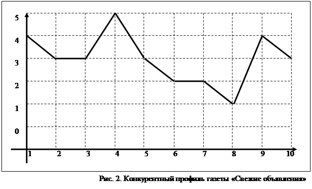 Для рассматриваемой газеты анализ показателей конкурентоспособности показал, что (рис. 2) общий индекс качества К0 составляет: К0 = (4+3+3+5+3+2+2+1+4+3)/10=3,00, что в соответствии с приведенной выше шкалой конкурентоспособности означает, издание обладает средним уровнем конкурентоспособности, и для его повышения необходимо в первую очередь предпринять следующие меры: