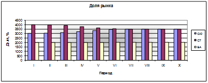 Исходя из исследований видно, что объём продаж на рынке возрастает с 7 тыс.шт. до 9 тыс.шт. в год, в тоже время повышается и цена. Доля рынка постепенно увеличивается.