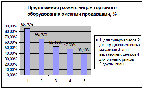 Ассортимент торгового оборудования, представленный в Омске, основывается на потребностях клиентов. Самая большая доля принадлежит товарам для супермаркетов – ее предлагают 85,7 процента продавцов. Второе место – оборудование для продуктовых магазинов (66,7 процента). За ними следует оборудование для выставок (52,4 процента) и другие виды. Предложение стеллажей в ассортименте различных омских фирм составляет от 2 до 20 видов, прилавков – от 3 до 100, стекловитрин – от 1 до 50, киосков – от 6 до 10 видов.