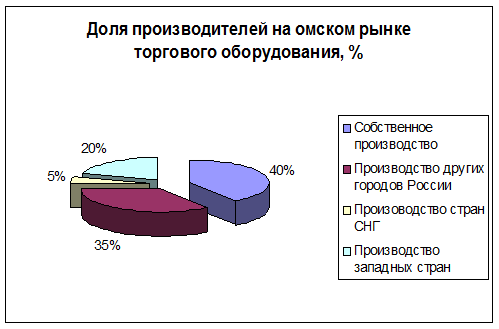 Около 40 процентов омских продавцов заявили, что вся реализуемая ими продукция производится самими фирмами. Остальные предлагают торговое оборудование, изготовленное в других российских городах (35 процентов), странах СНГ (5 процентов) и западных странах (20 процентов). Из российских игроков на нашем рынке больше всего представлены фирмы из Москвы («Меран», «ДВК», «Промед», «Пилот»), а также из Санкт-Петербурга, Нижнего Новгорода, Твери, Новосибирска. Западная продукция широко представлена итальянскими фирмами MEP, NFA, ATN. Есть в Омске продукция производителя Голландии (Abbot), а также некоторых других стран. Около 20 процентов омских продавцов являются представителями более крупных фирм.