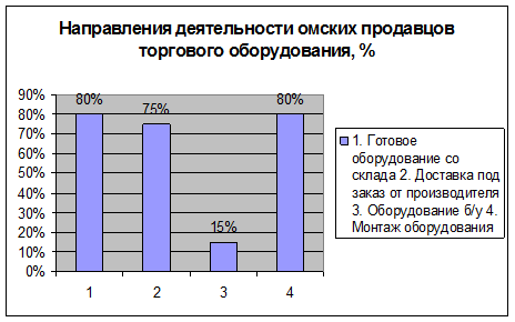 80 процентов омских продавцов торгового оборудования предлагают клиентам готовую продукцию со склада, около 75 процентов осуществляют доставку под заказ от производителя. Оборудование, бывшее в употреблении, реализуют около 15 процентов продавцов.