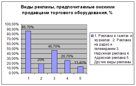 Согласно проведенным исследованиям, подавляющее большинство продавцов торгового оборудования наиболее эффективной рекламой своей продукции считают рекламу в газетах и журналах (86,7 процента), используется также наружная реклама (46,7 процента). Менее всего востребована реклама на радио и телевидении (20 процентов) и адресная реклама (26,7 процента).