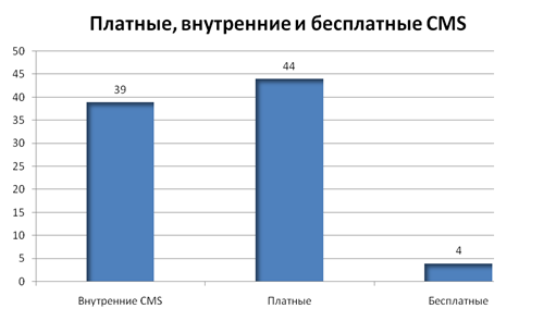 Видно (рис. 1), что предпочтение разработчики чаще всего отдают не общедоступным CMS. Это наблюдается из-за того, что качество и функциональность свободных CMS значительно ниже платных либо разработанных собственными силами.