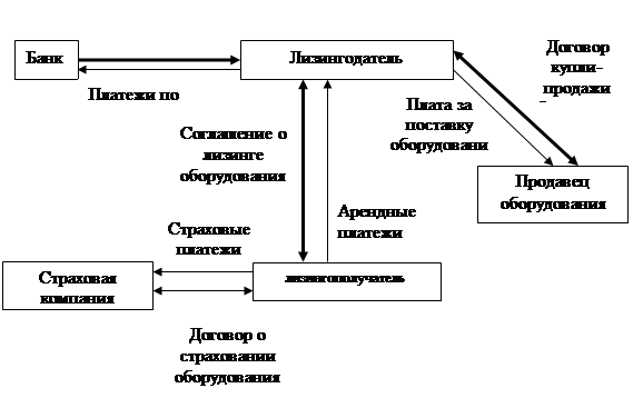 На схеме жирные стрелки характеризуют правовые основы лизинговой сделки, тонкие – движение денежных средств и объекта лизинга между участниками сделки.