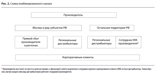 Вариантом решения может быть создание комбинированного канала сбыта. В этом случае объединяют две концепции дистрибуции: в структуру непрямого канала сбыта включают прямых продавцов и технологии работы с крупными клиентами, созданное производителем (рис. 2).