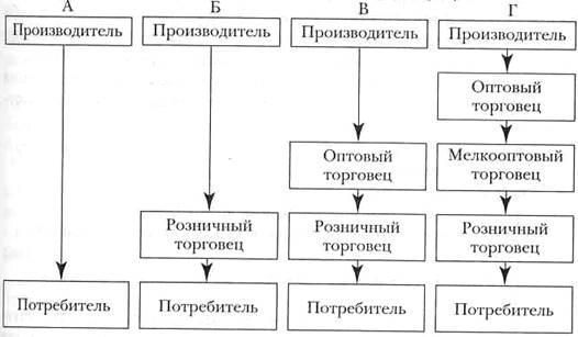 Каналы Б, В и Г относятся к косвенным каналам распределения. При реализации товаров производственно-технического назначения посредником в одноуровневом канале распределения выступает агент по сбыту или брокер. В двухуровневом канале распределения посредником обычно бывают промышленный дистрибьютор и дилер.