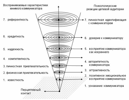 В процессе перцепции рекламного сообщения наличие каждой характеристики мнимого коммуникатора вызывает у представителей целевой аудитории соответствующую психологическую реакцию. Так, известность предполагает узнавание коммуникатора, физическая привлекательность – позитивное восприятие, личностная привлекательность – аттрактивность, компетентность – авторитетность, надежность – восприятие его как искреннего, кредитность – доверие. Использование в рекламном сообщении мнимого коммуникатора повышает его коммуникативную эффективность.