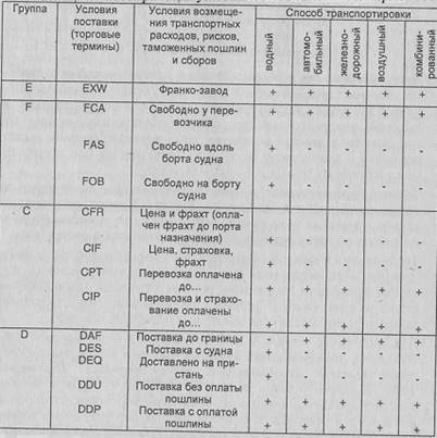 Транспортный фактор оказывает большое влияние на формирование внешнеторговых цен. Однако типовые условия поставки продукции по-разному регламентируются законодательством разных стран. Стороны, заключающие международные контракты, не всегда осведомлены о подобных нюансах. Для того чтобы устранить этот недостаток внешнеторговой деятельности, Международная торговая палата в 1936 г. ввела в действие перечень международных правил торговли "Инттермс1936" (базисные условия поставки - БУП), в которых, в частности, оговаривались единые условия транспортировки товаров и обязанности продавца и покупателя при распределении между ними транспортных и других расходов. В данный документ вносились изменения в 1953 г., 1967 г., 1976 г., 1980 г., 1990 г. и 2000 г. В настоящее время действует "Инкотермс 2000", насчитывающий 13 терминов, распределенных по четырем группам: Е, F, С, D.