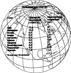 В последние годы несколько крупных маркетинговых систем Internet потерпели неудачу из-за слишком малого числа их абонентов, слишком слабого использования или просто потому, что процедуры совершения покупок казались пользователям этих систем чересчур запутанными и сложными, и они решили вернуться к привычным способам покупки товаров. Первые службы оперативной информации и "электронных покупок" появились в США. Несмотря на то, что использование Internet и интерактивный маркетинг переживают пока стадию становления, их развитие носит бурный, лавиноподобный характер. В соответствии с недавно проведенным исследованием, 23% жителей США и Канады в возрасте от 16 лет и старше (что составляет свыше 50 миллионов человек) пользовались услугами Internet. (Сравните с 1 миллионом в конце 2002 года) Кроме того, 12% взрослого населения пользуются услугами коммерческих оперативно-информационных служб, таких как America Online и CompuServe. В настоящее время на нашей планете насчитывается примерно 105 миллионов пользователей Internet. Рис.1 иллюстрирует масштабы использования Internet (пользователи Internet в процентном выражении от всего населения) в десяти ведущих странах мира. По оценке специалистов, использование Internet растет со скоростью 12 тысяч новых пользователей ежедневно. Некоторые аналитики предсказывают, что не так далек тот день, когда число пользователей Internet достигнет одного миллиарда, а объем сделок, заключаемых по Internet, достигнет 150 миллиардов долларов в год. (Кое-кто утверждает, что это произойдет уже в 2010 году) [2]