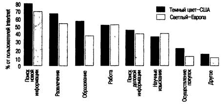 Несмотря на то, что основная доля мирового интерактивного маркетинга приходится на США, a Internet все еще не стала основным средством продвижения товаров на рынок, европейские производители уже не могут игнорировать эти новые технологии. Сейчас в мире насчитывается от 4 до 6 миллионов Web-узлов, а их количество увеличивается примерно на 400 новых узлов каждую неделю. Рис.2 иллюстрирует тот факт, что пользователи входят в Internet по разным причинам: от простого желания посмотреть, что там появилось новенького, до чисто практических потребностей (работа, образование, развлечения).