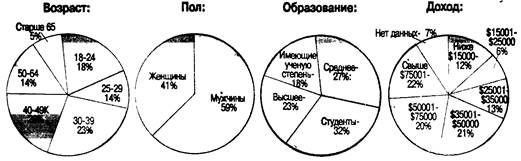 В целом пользователи Internet представляют собой в некотором смысле элитную группу. Это достаточно молодые, образованные и обеспеченные люди, заметно большую часть которых составляют мужчины. Однако чем больше людей вовлекается в использование Internet, тем больше их демографический состав приближается к тому, который характерен для населения нашей планеты в целом (по крайней мере, для развитых стран). По мере развития Internet будет обеспечивать доступ производителей товаров ко все более широкому спектру демографических сегментов. Например, за последние два года женская часть "населения" Internet практически удвоилась и составляет в настоящее время 41%. Хотя больше половины всех пользователей Internet составляют профессионалы и менеджеры, их относительное количество неуклонно сокращается за счет притока широких масс "дилетантов".