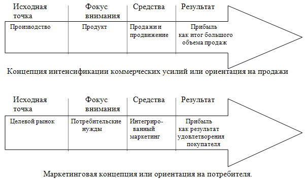 Если исходить из классификации теории "управления маркетингом", предложенной профессором маркетинга Северо-Западного университета США Филиппом Котлером, то под "концепцией маркетинга" понимается "сравнительно новый подход в предпринимательской деятельности", который "утверждает, что залогом достижения целей организации являются определение нужд и потребностей целевых рынков и обеспечение желаемой удовлетворенности более эффективными и более продуктивными, чем у конкурентов, способами".
