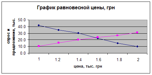 Вывод: Равновесная цена в данной задаче равна 1 тыс 580 грн., а равновесный спрос и предложение равен 23 тыс. шт.
