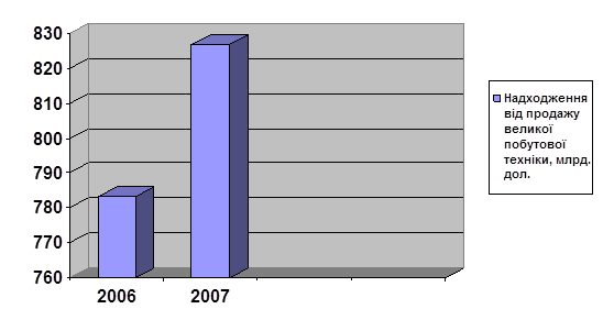 Компанія TERJI проводила оцінку ринку великої побутової техніки у світі і встановила, що надходження від продажу великої побутової техніки збільшилися з 783,3 млрд. дол. США у 2006 році до 826,8 млрд. дол. США у 2007 році, що повязують зі зростанням платоспроможного попиту в країнах Латинської Америки, СНД та Африки, за рахунок продажу в яких і зріс даний показник. Динаміка надходжень від продажу великої побутової техніки за період 2006-2007 років наведена на рис. 2.