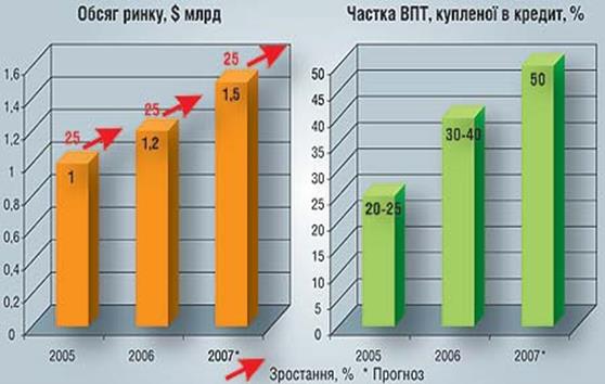 Попит на дорогу техніку збільшується завдяки не лише підвищенню доходів, а й демократизації споживчого кредитування. Великі торговельні мережі самі виплачують відсотки банку, пропонуючи покупцям безвідсотковий кредит, тобто покупку в розстрочку. Торік кредитом користувалися тільки 20-25% покупців великої побутової техніки, а в 2006-му цей показник збільшився до 30-40%. У 2007 році торговельні мережі мають намір реалізувати в кредит 50% ВПТ від загального продажу. Грошовий обсяг ринку підтягнеться наступного року приблизно до $1,5 млрд., традиційно збільшившись на чверть. Зростання кількості покупок у 2007-му не перевищить 15%, а в 2008 році, швидше за все, впаде до 10%. Надалі цей бізнес розвиватиметься здебільшого за рахунок реплейсменту.