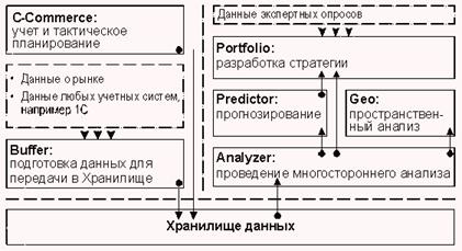 Комплекс Marketing Analytic 4 имеет модульную структуру. Это модули аналитического CRM - "Analyzer", "Geo", "Portfolio" и "Predictor", - а также модуль оперативного CRM - "c-Commerce". Каждый модуль может быть использован как по отдельности, так и в комплексе с другими модулями. Кроме того, он может быть включен в другие корпоративные системы. Схема обмена данными между модулями приведена на рисунке 1.
