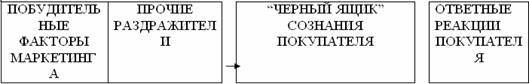 Основной вопрос: как именно реагируют потребители на разные побудительные приемы маркетинга, которые фирма может применить? Фирма, по-настоящему разобравшаяся в том, как реагируют потребители на различные характеристики товара, цены, рекламные аргументы и т.п., будет иметь огромное преимущество перед конкурентами. Именно поэтому и фирмы и научные работники тратят так много усилий на исследование зависимостей между побудительными факторами маркетинга и ответной реакцией потребителей. Отправной точкой всех этих усилий является простая модель, представленная на рис. 1. На нем показано, что побудительные факторы маркетинга и прочие раздражители проникают в «черный ящик» сознания покупателя и вызывают определенные отклики. [3]