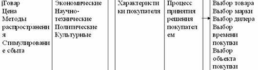На рис. 1 эта же модель представлена в более развернутом виде. В левом прямоугольнике ¾ побудительные факторы двух типов. Побудительные факторы маркетинга включают в себя четыре момента: товар, цену, методы распространения и стимулирования. Прочие раздражители слагаются из основных сил и событий из окружения покупателя; экономической, научно-технической, политической и культурной среды. Пройдя через «черный ящик» сознания покупателя, все эти раздражители вызывают ряд поддающихся наблюдению покупательских реакций, представленных в правом прямоугольнике: выбор товара, выбор марки, выбор дилера, выбор времени покупки, выбор объема покупки.
