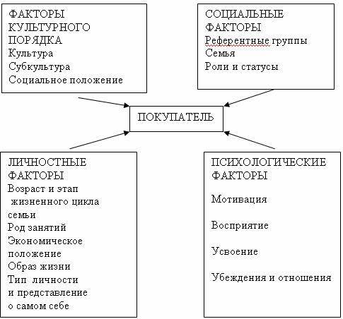 На поведение покупателя оказывают влияние четыре основные группы факторов: факторы культурного уровня (культура, субкультура и социальное положение), факторы социального порядка (референтные группы, семья, роли и статусы), факторы личного порядка (возраст и этап жизненного цикла семьи, род занятий, экономическое положение, образ жизни, тип личности и представление о самом себе) и факторы психологического порядка (мотивация, восприятие, усвоение, убеждения и отношения). Все они дают представление о том, как эффективнее охватить и обслужить покупателя.