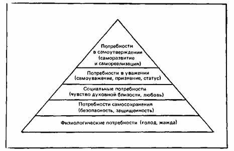 Теория мотивации Маслоу. Авраам Маслоу попытался объяснить, почему в разное время людьми движут разные потребности. Почему один человек тратит массу времени и энергии на самосохранение, а другой ¾ на завоевание уважения окружающих? Ученый считает, что человеческие потребности располагаются в порядке иерархической значимости от наиболее до наименее настоятельных. Разработанная Маслоу иерархия представлена на рис. 33. По степени значимости потребности располагаются в следующем порядке: физиологические потребности, потребности самосохранения, социальные потребности, потребности в уважении и потребности в самоутверждении. Человек будет стремиться удовлетворить в первую очередь самые важные потребности. Как только ему удается удовлетворить какую-то важную потребность, она на время перестает быть движущим мотивом. Одновременно появляется побуждение к удовлетворению следующей по важности потребности.