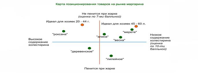 Карты позиционирования – наиболее популярный способ визуального представления возможностей фирмы. Так, если выявить идеальные предпочтения потребителей, а также место товара и товаров конкурентов относительно их предпочтений, сможем провести анализ маркетинговых возможностей. Ниже приводится пример карты позиционирования товаров на рынке маргарина: