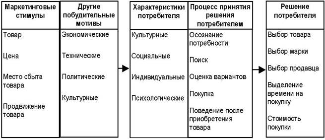 На нем показано, что побудительные факторы маркетинга и прочие раздражители проникают в “черный ящик” сознания покупателя и вызывают определенные отклики. Побудительные факторы маркетинга включают в себя четыре элемента: товар, цену, методы распространения и стимулирования. Прочие раздражители слагаются из основных сил и событий из окружения покупателя; экономической, научно-технической, политической и культурной Среды. Пройдя через “черный ящик” сознания покупателя, все эти раздражители вызывают ряд поддающихся наблюдению покупательских реакций, представленных в правом прямоугольнике: выбор товара, выбор марки, выбор дилера, выбор времени покупки, выбор объема покупки. Задача деятеля рынка - понять, что происходит в “черном ящике” сознания потребителя между поступлением раздражителей и появлением откликов на них. Сам “черный ящик” состоит из двух частей. Первая - характеристики покупателя, оказывающие основное влияние на то, как человек воспринимает раздражители и реагирует на них. Вторая часть - процесс принятия покупательного решения, от которого зависит результат.
