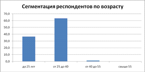При сегментация по возрасту опрошенных респондентов выявили 4 группы: до 25 лет, 25-40 лет, 40-55 лет; свыше 55 лет. Выяснилось, что основная масса потребителей – 63,3% является в возрасте от 25 до 40 лет. 36,7% респондентов в возрасте до 25 лет. И всего лишь в количестве 1,3% выявилось респондентов в возрасте от 40 до 55 лет. Так же результаты тестирования показали, что свыше 55 лет, респондентов выявлено не было. Отсюда следует вывод, что в практически все покупатели являются молодыми родителями.