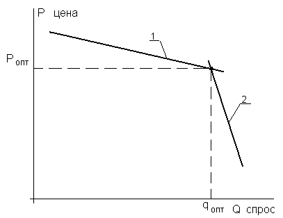 Рисунок 8 – Кривая спроса: 1-более эластичный спрос; 2 – менее эластичный спрос; Ропт – оптимальный уровень цены