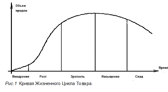 Жизненный цикл товара может быть представлен как определенная последовательность стадий существования его на рынке, имеющая определенные рамки. Динамика жизни товара показывает объем продаж в каждое определенное время существования спроса на него.