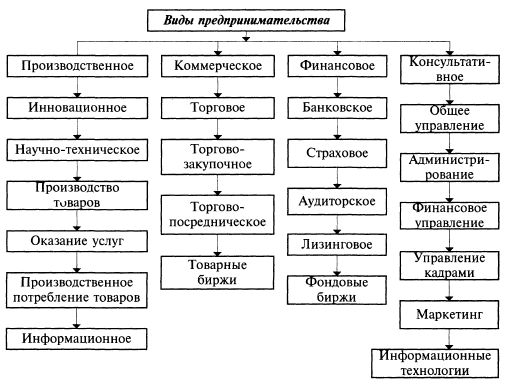 в соответствии с принятой структурой процесса воспроизводства (производство, обмен, распределение, потребление) выделяет четыре главных сферы предпринимательства: производственную, коммерческую, финансовую и сферу потребления. Другие виды предпринимательской деятельности, например, инновационная, маркетинговая, включаются в состав четырех главных сфер предпринимательства.