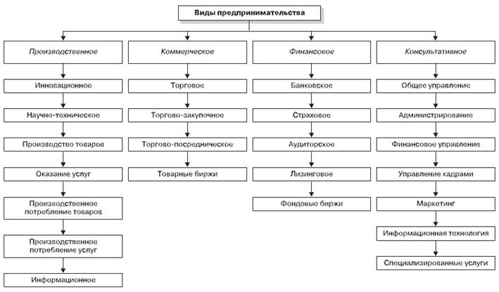 В книге В. Я. Горфинкеля «Организация предпринимательской деятельности» даётся следующая классификация предпринимательской деятельности. По виду или назначению предпринимательская деятельность может быть производственной, коммерческой, финансовой, консультативной и др. Все эти виды могут функционировать раздельно или вместе.