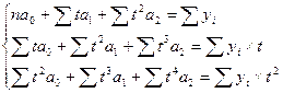 | Месяц | Число семей, состоявших на учете на получение жилья, тыс.ед., yi | Номер месяца, t | t2 | t3 | t4 | yi xt | yi xt2 | yt | (yi -yt )2 | yi 2 |