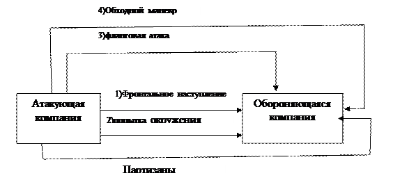 Фронтальная атака характеризуется активными действиями на позиции конкурента, попытками превзойти его по сильным аспектам его деятельности (продукты, реклама, цены и т.д.). для ее реализации организация должна иметь ресурсов больше, чем конкурент и быть в состоянии вести длительные «боевые действия».