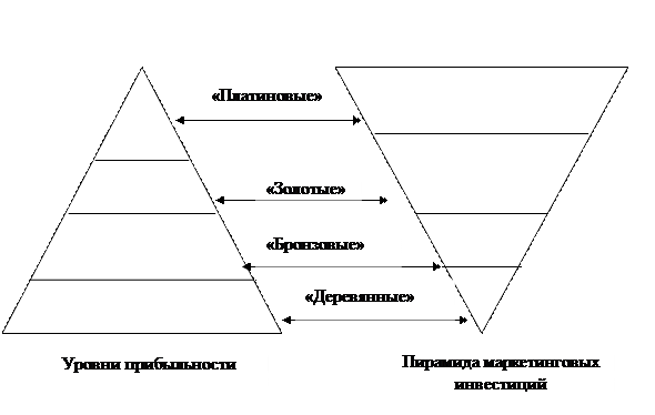 Американские компании, такие как AmericanExpress, UnitedParcelService рассматривают уровень доходов своих клиентов как один из факторов своей конкурентоспособности, так как при повышении доходов покупателей фирмы имеют возможность повысить уровень собственных доходов. Они ввели такое понятие как выгодный потребитель – индивид, торговая организация или компания, в течение продолжительного времени приносящий доход, который превышает издержки фирмы-производителя по привлечению заказчика. Эти компании классифицируют потребителей по уровню их прибыли: «платиновые» клиенты (наиболее прибыльные), «золотые» (прибыльные), «бронзовые» (малоприбыльные) и «деревянные» (неприбыльные). Задача компании - переводить «бронзовых» покупателей в разряд «золотых», а «золотых» - в разряд «платиновых». От «деревянных» следует либо отказаться, либо увеличивать их прибыльность. Для этого необходимо увеличивать цены либо уменьшать затраты на обслуживание. В целом, чем выше уровень прибыльности, тем больше должны быть маркетинговые инвестиции (рис. 6).
