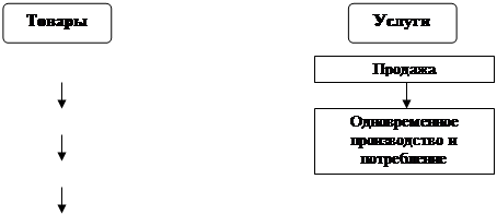 Оказать услугу можно лишь тогда, когда поступает заказ или появляется клиент. Различие между товарами и услугами с точки зрения взаимосвязи производства и потребления характеризует рис.1.1.