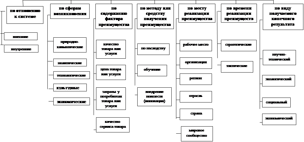 По отношению к системе (организации, стране) принято различать внутренние и внешние преимущества.