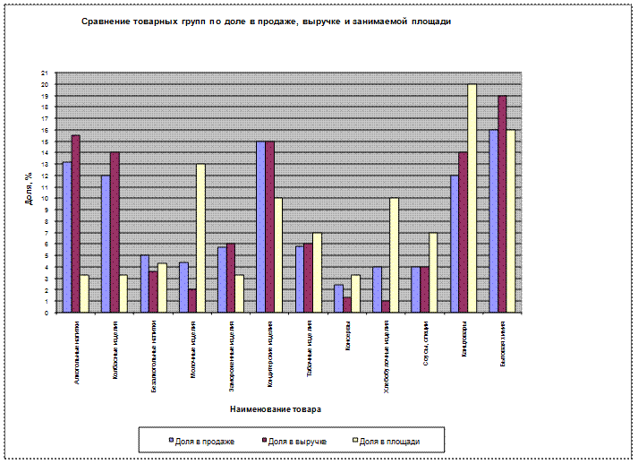 Площадь под алкогольные напитки, колбасные изделия, безалкогольные напитки, молочные продукты, замороженные мясные изделия, хлебобулочные, табачные изделия, консервы, соусы, канцтовары используется полностью и следовательно, эти товары являются дефицитным ресурсом в магазине и дополнительное привлечение 1м