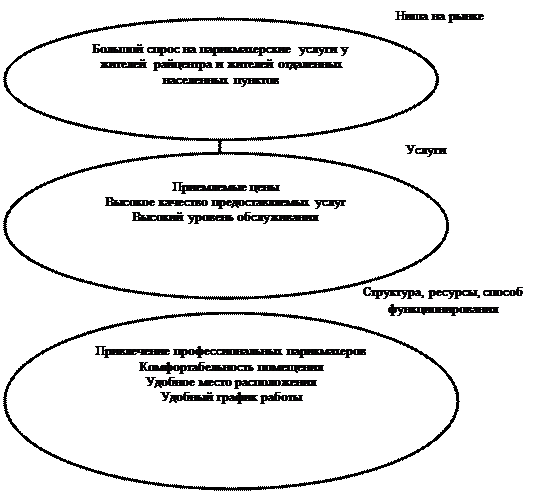 Парикмахерская ИП "Елена" будет оказывать услуги: стрижка мужская, женская, детская; окраска, химические завивка; мелирование, тонирование; лечение, уход за волосами; прически свадебные, вечерние. Услуги будут предоставляться с применением профессиональной косметики "Londa", "Akzent", "Kinetics". Цены парикмахерской ориентированы на клиентов со средним достатком. Тем более, что мы предполагаем сохранить цены стабильными, при условии если это же будет гарантировано нашими поставщиками расходного инвентаря, с которым нас связывает соглашение, предусматривающее возможность повышения отпускных цен.