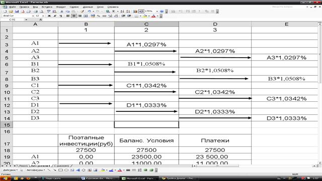 2.2 А2*1,0297+B2*1,0508%+С2*1,0342+D2*1,0333-A3-B3-C3-D3=11000