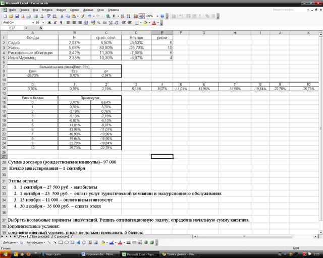 Обобщив полученные ранее результаты, имеем данные по видам фондов, их продолжительности, возможные сроки вложения, доходности и риск в баллах в следующей таблице: