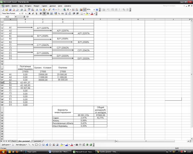 Эта задача была решена в пакете Microsoft Excel с применением надстройки «Поиск решения». Сначала решим задачу без учета ограничений на риск. Тогда задача планирования инвестиций будет ограничиваться только балансовыми условиями. После внесения их в надстройку «Поиск решения», оптимальное решение данной оптимизационной задачи было найдено.