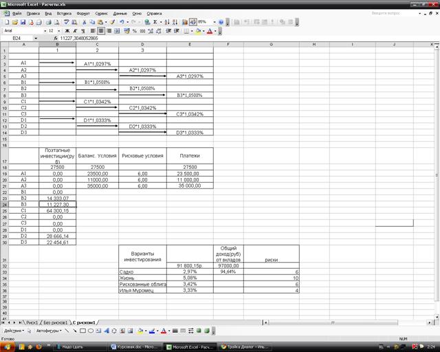Теперь решим задачу с учетом всех ограничений балансовых и на риск. После внесения ограничений на риск в надстройку «Поиск решения», результат решения данной оптимизационной задачи изменился. Результаты представлены в приложении рисунок 3.