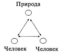 Обмен человека и природы имеет линейное развитие до возникновения обмена между людьми. Возникновение обмена человек - человек и дальнейшее становление экономических взаимоотношений придает обмену еще одно важное направление развития. С этого момента обмен, а вместе с ним и маркетинг, приобретают двунаправленное развитие. Человек становится участником как обмена человек - человек, так и обмена человек - природа. При внимательном рассмотрении становится ясно, что оба обмена основываются на использовании природных ресурсов: для обмена человек -природа это очевидно, но и в обмене человек – человек в той или иной форме участвуют природные материалы, т. е. оба обмена замыкаются на природу. Таким образом, возникает треугольник обмена человек - природа – человек (рис. 1).