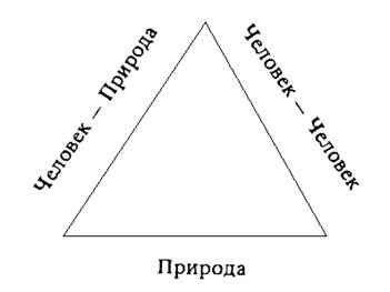 Действительно, как было показано, оба обмена основываются на использовании природных ресурсов, т. е. имеют своим источником природную среду, являющуюся базисной составляющей этого треугольника. На этапе возникновения оба обмена были представлены простейшими формами и сопровождались “узостью мировоззрения”, что обусловило их относительное “разнесение”. В дальнейшем обе ветви, диалектически развиваясь под воздействием человеческого эгоизма, имеют тенденцию к сближению и, в идеале, к пересечению. Это связано с тем, что обе ветви обмена, и “человек — человек”, и “человек — природа”, являются, по сути, двумя видами одного целого, а именно: удовлетворения человеком своих потребностей, которые в своем развитии дополняют и усиливают друг друга. Эволюционируют все три составляющие треугольника. Нижняя, базисная сторона в процессе эволюции наполняет треугольник связующей, питательной природной средой, в которой и происходят все взаимодействия.