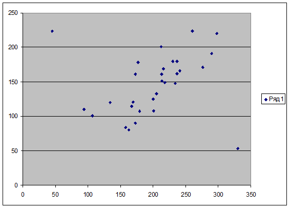 На построенной диаграмме рассеяния (см. Диаграмма 1) визуально видно наличие аномальных точек. Это предприятие №25 (среднегодовая стоимость основных производственных фондов – 45 млн руб.; выпуск продукции – 224 млн руб.) и предприятие №31 (среднегодовая стоимость основных производственных фондов – 330 млн руб.; выпуск продукции – 53 млн руб.). Исключим аномальные единицы наблюдения из первичных данных. Внесем аномальные единицы наблюдения в таблицу 2.