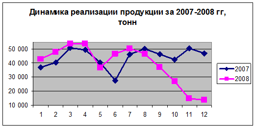 Объем реализованной металлопродукции в натуральном выражении за 2008 год составил 472 042 тонн (снижение к уровню 2007 года – 10,8%) представлены в таблице 3, динамика реализации продукции в натуральном выражении за 2007-2008 гг. рассмотрены на рис.4.