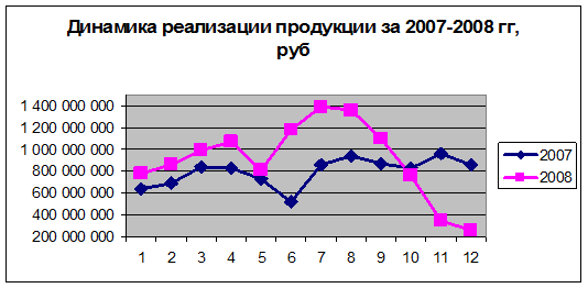 Динамика реализации продукции за 2007-2008 гг. в денежном выражении иллюстрирует рис. 5.