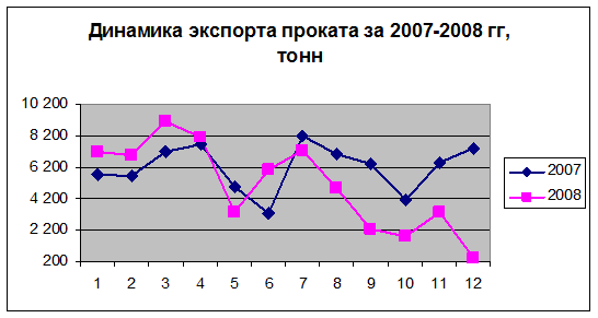 В силу ухудшения конъюнктуры внешнего рынка в 2008 году произошло снижение объема реализации проката по экспортным контрактам. В результате за 2008 год отгружено на экспорт 60 910 тонн продукции, что на 13 263 тонн ниже показателя 2007 года (снижение к 2007 году составило 17,9%). Динамика экспорта проката за 2007-2008гг. в натуральном выражении выглядит следующим образом (см. рис. 6):