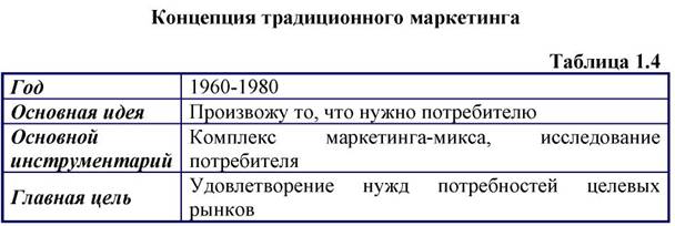 Традиционная маркетинговая концепция оформилась около середины 50-х годов, тогда как сам маркетинг возник значительно раньше. Это подход в предпринимательской деятельности, характерен для постиндустриального периода экономического развития. Маркетинговая концепция ориентирована на покупателей, и подкреплена комплексом мер, нацеленных на удовлетворение потребностей рынка. В данном случае маркетинговые мероприятия начинаются с выявления реальных и потенциальных покупателей и их потребностей. Согласно этой концепции цели предприятия, особенно долгосрочные, могут быть достигнуты только благодаря исследованию потребностей и желаний групп потребителей, которым предприятие направляет и предлагает изделия и услуги, удовлетворяющие их по качеству и эффективности.