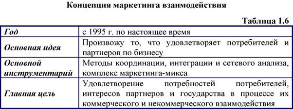 В заключение обзора концепций маркетинга необходимо отметить, что маркетинг взаимодействия не единственная концепция, которой может следовать фирма в современном мире. Выбор одной из приведенных выше концепций определяется доминирующим видом маркетинговой деятельности, факторами конкурентного преимущества, чувствительностью покупателей к изменению цен и рядом других. Следовать концепции маркетинга взаимодействия фирму стимулируют, прежде всего, усиливающаяся конкуренция и увеличивающаяся требовательность покупателей, которые ориентируют производителя на внесение изменений в структуру существующего предложения за счет превосходства в управлении взаимоотношениями.